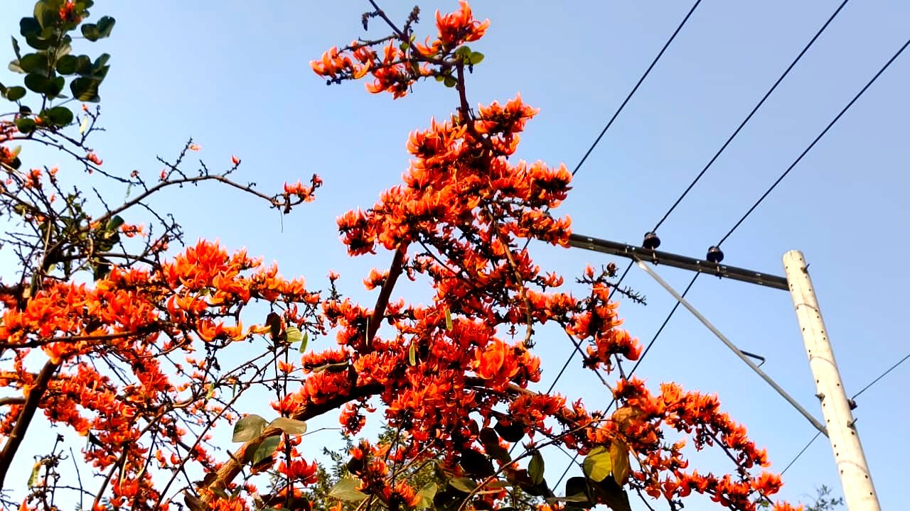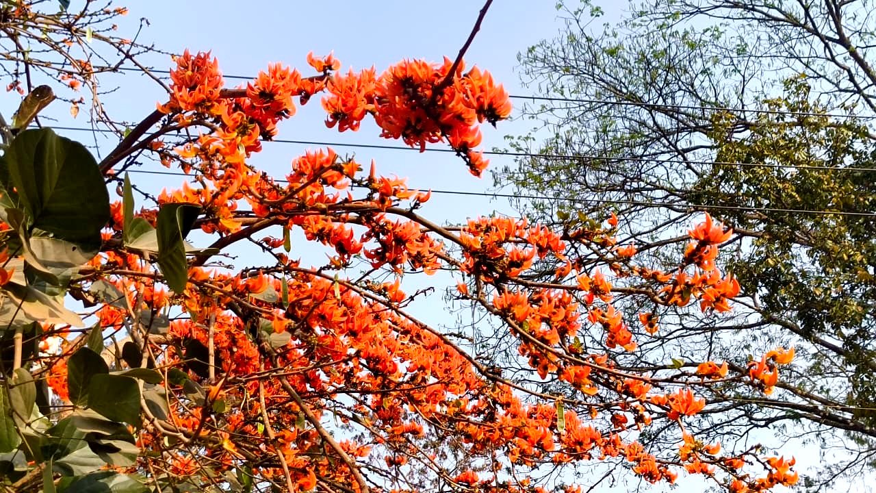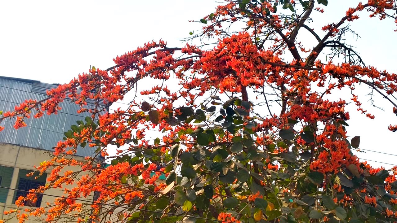 উপজেলা পরিষদের প্রধান সড়কের পাশে দাঁড়ানো কয়েকটি পলাশগাছ যেন আলাদা করে দৃষ্টি কাড়ছে। ফাল্গুন–চৈত্রের এই সময়ে গাছগুলো প্রায় পাতাশূন্য হয়ে ফুলে ভরে উঠেছে। লাল, হলুদ ও লালচে কমলা—পলাশের তিনটি প্রধান রঙের মধ্যে আগুনরাঙা কমলাই এখানে সবচেয়ে উজ্জ্বল হয়ে ফুটে উঠেছে। সকাল বাড়ার সঙ্গে সঙ্গে রোদের তাপে ফুলের রঙ আরও গাঢ় হয়ে ওঠে; নিচে ঝরে পড়া পাপড়িতে লাল কার্পেটের মতো দৃশ্য তৈরি হয়।
